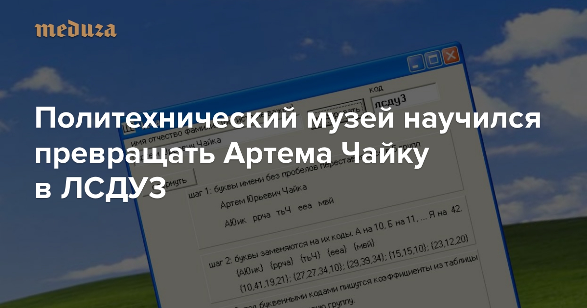 Слишком сложно? О, да. Поэтому математики написали программу (только Windows, скачать на свой страх и риск можно здесь), которая автоматически преобразует имена. Артема Чайку она, понятное дело, превращает в ЛСДУ3: