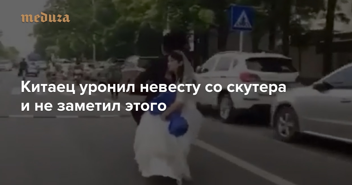На странице Peopleʼs Daily Online опубликовали видео с молодоженами, которые едут на скутере — судя по всему, со свадьбы. Когда скутер переезжал через «лежачего полицейского», невеста не удержалась и упала на асфальт. Жених не заметил этого и поехал дальше.