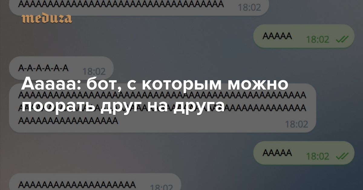 В Telegram появился такой бот, его зовут Ааааа. Ааааа выполняет одну простую задачу: отвечает на ваше ААААА своим А-А-А-А-А-А. Или ААААААА. Или ААААААААААААААААААА.