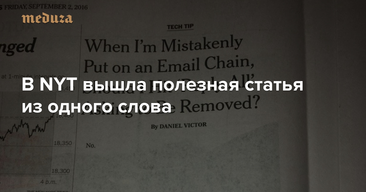 Статья озаглавлена так: «Если меня по ошибке добавляют в цепочку электронных писем, должен ли я нажать „Ответить всем“ и попросить убрать меня из переписки?» Текст состоит из слова «Нет».