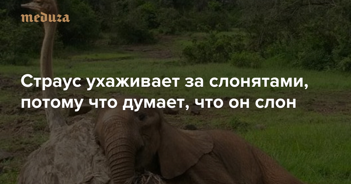 Страус ухаживает за слонятами, потому что думает, что он слон
