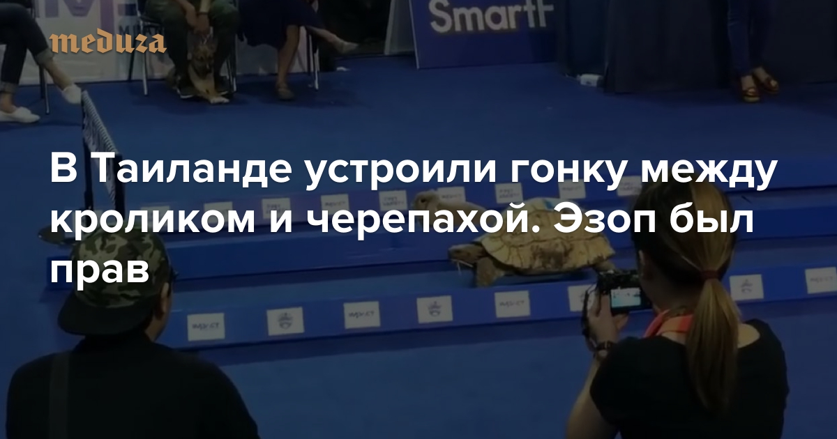 Где-то в Таиланде (по всей видимости, на выставке животных) устроили гонки между черепахой и кроликом. Сначала кролик уверенно лидировал, но затем испугался шума и остановился. Пока хозяйка пыталась его подбодрить и заставить бежать дальше, черепаха спокойно добралась до финиша.