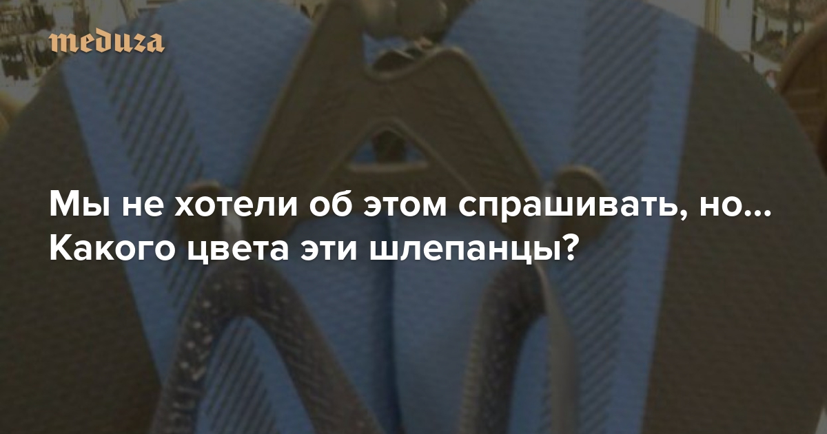 Мнения в редакции «Медузы» разделились: одни считают, что шлепанцы бело-золотые или золотые с голубым, другие видят их черно-синими. Как показал опрос Buzzfeed, большинство людей видят белый и золотой цвета. Этот вариант набрал 45 процентов голосов. На втором месте вариант «золотой и голубой».