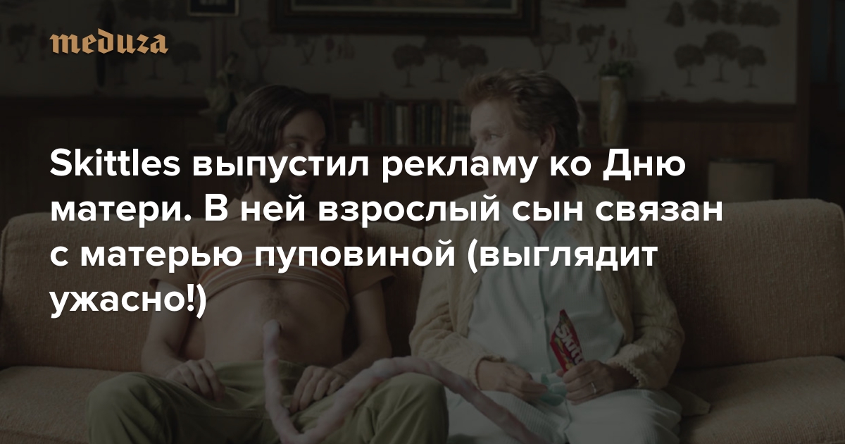 Skittles выпустил рекламу ко Дню матери. В ней взрослый сын связан с матерью пуповиной (выглядит ужасно!)