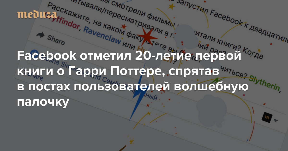 К 20-летию выхода книги «Гарри Поттер и философский камень» Facebook спрятал в постах пользователей «пасхальное яйцо». Если в посте или комментариях написать имя Гарри Поттера и названия факультетов на английском языке, то они автоматически поменяют цвет. Гриффиндор станет красным, а Слизерин — зеленым.