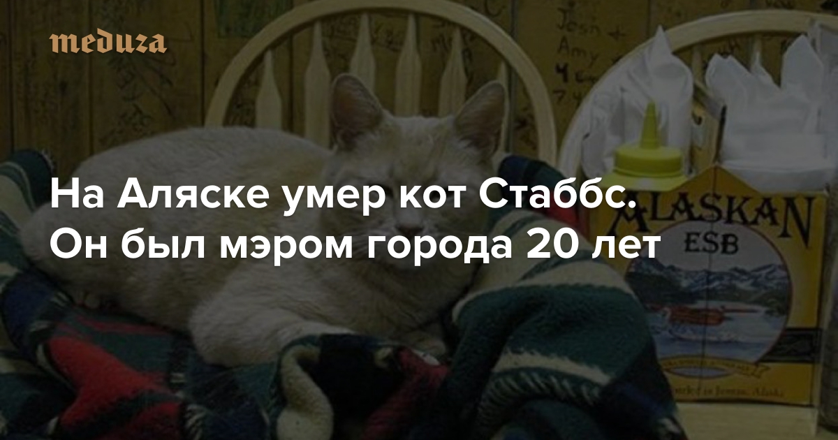 В Талкитне (штат Аляска) 21 июля умер кот по кличке Стаббс, который с 1998 года занимал должность мэра поселения. Ему было 20 лет.