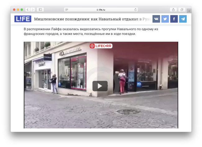 Алексей Навальный рассказал, что увидел задание от LifeCorr, когда находился во Франции. Он заехал с женой в Руан, и Юлия сняла короткое видео о его прогулке по городу. В оригинале ролик был чуть длиннее, чем тот, что выложил «Лайф», — в конце исходного видео происходит такой диалог: