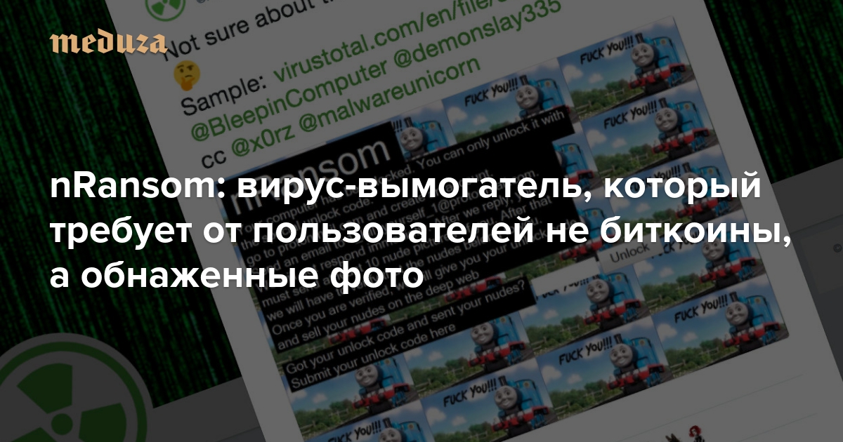 «После этого нам нужно будет убедиться, что это ваши фотографии. Как только это произойдет, мы пришлем вам код для разблокировки компьютера. А ваши фото мы продадим в глубокой сети», — говорится в сообщении. Оно размещено на фоне повторяющейся картинки с паровозиком Томасом, восклицающим: «Пошел на ***».