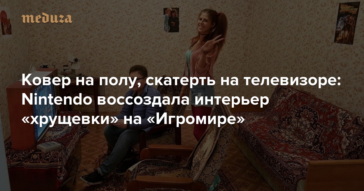 Компания Nintendo установила на игровой конференции «Игромир», которая проходит с 28 сентября по 1 октября в Москве, стенд, повторяющий интерьер «хрущевки». В комнате висят непритязательные обои с постерами, стоят диван и кресло с деревянными подлокотниками, а также телевизор, имитирующий старые ламповые ТВ, на полу — линолеум. И ковры, везде разложены ковры!