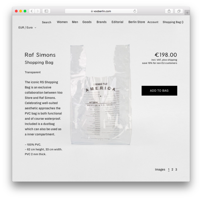 Берлинский концепт-стор Voo Store выпустил коллаборацию с бельгийским дизайнером Рафом Симонсом. В коллекцию вошла одна вещь — многоразовый пакет из стопроцентного пластика за 198 евро (почти 14 тысяч рублей).