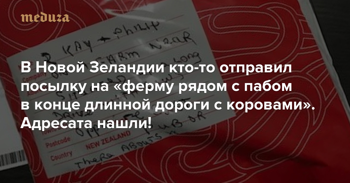 В середине марта почтовая служба новозеландского городка Каст попросила пользователей фейсбука помочь найти адресата одной посылки. Вместо улицы и дома на свертке были указаны имена — Кей и Филипп — и описание местности. Отправитель просил доставить посылку на ферму, расположенную рядом с пабом на длинной дороге с коровами.