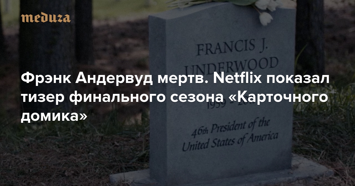 Стриминговый сервис Netflix выпустил тизер финального, шестого сезона сериала «Карточный домик». В нем показана могила «46-го президента США Фрэнсиса Андервуда».