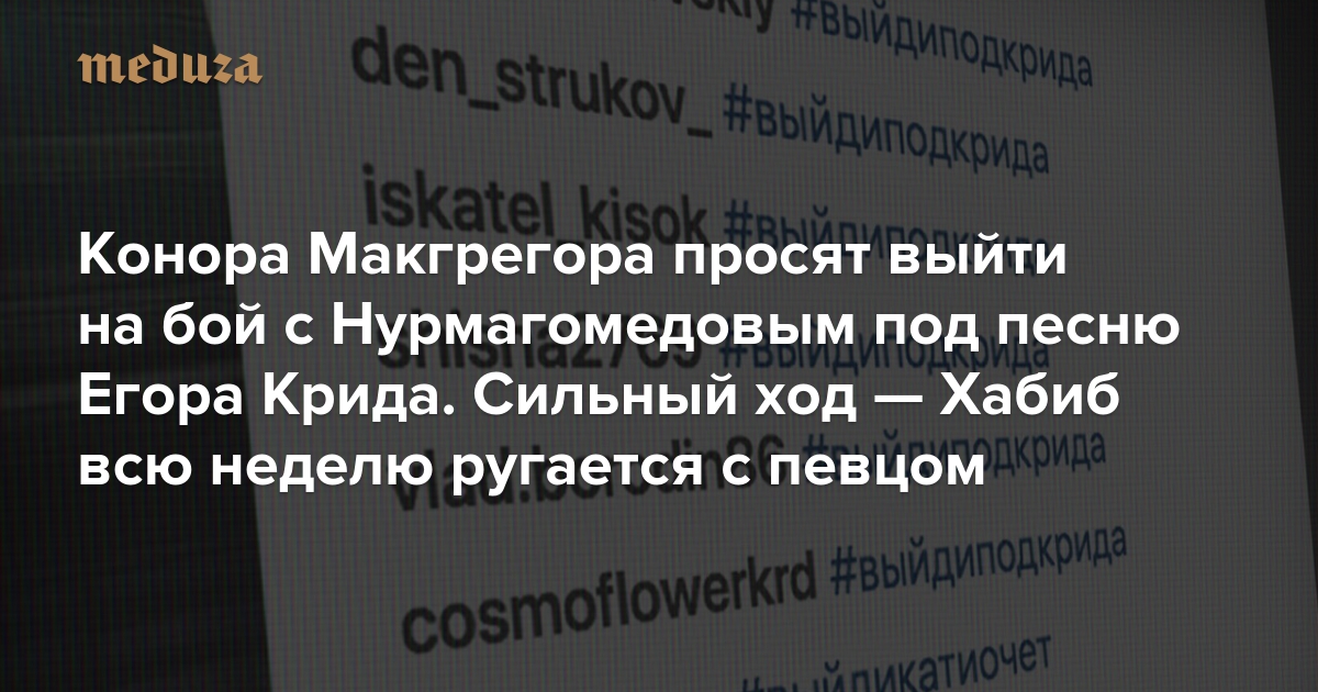 Теперь пользователи соцсетей призывают Конора Макгрегора, бойца MMA, с которым 6 октября у Нурмагомедова состоится бой, выйти на ринг под песню Егора Крида. Сообщения с этим хэштегом появились под фотографиями в инстаграме Макгрегора.