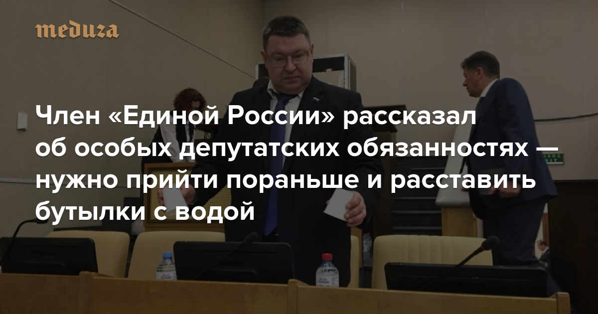Член «Единой России» рассказал об особых депутатских обязанностях — нужно прийти пораньше и расставить бутылки с водой