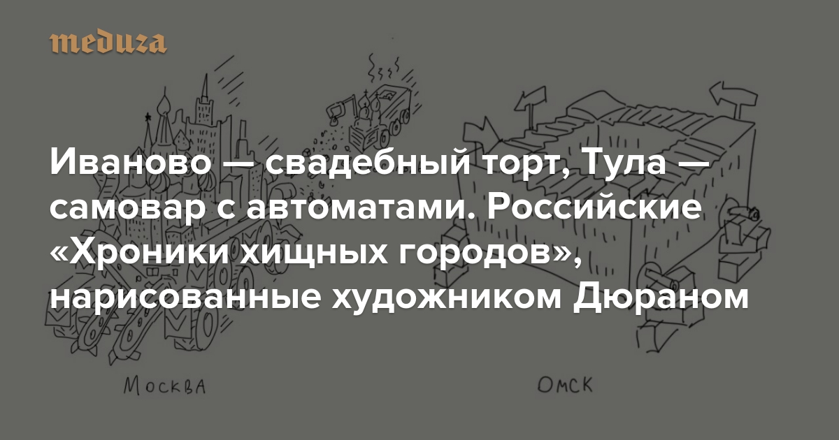 Анонимный российский художник Дюран нарисовал комикс по мотивам фильма «Хроники хищных городов», в котором города ездят на гигантских колесах и поглощают поселения поменьше (а еще там есть оружие под названием «Медуза»!). В версии Дюрана участвуют Иваново, Тула, Новосибирск, Омск и другие российские города. Обратите внимание на Москву (чей мусор развозят по регионам) и Санкт-Петербург (который занесло снегом). «Медуза» с разрешения автора публикует комикс целиком.