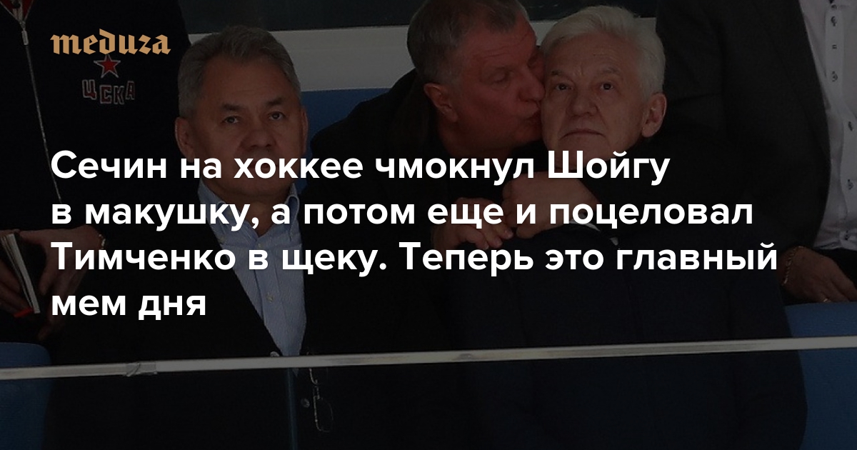 Сечин на хоккее чмокнул Шойгу в макушку, а потом еще и поцеловал Тимченко в щеку. Теперь это главный мем дня