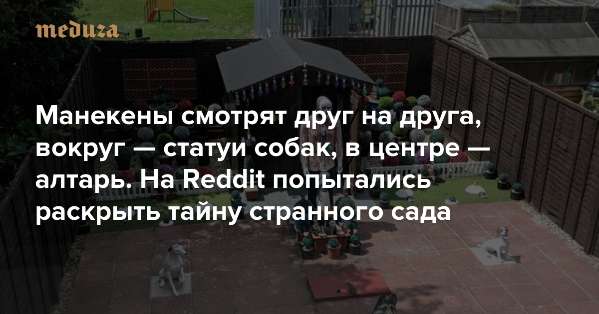 Манекены смотрят друг на друга, вокруг — статуи собак, в центре — алтарь. На Reddit попытались раскрыть тайну странного сада