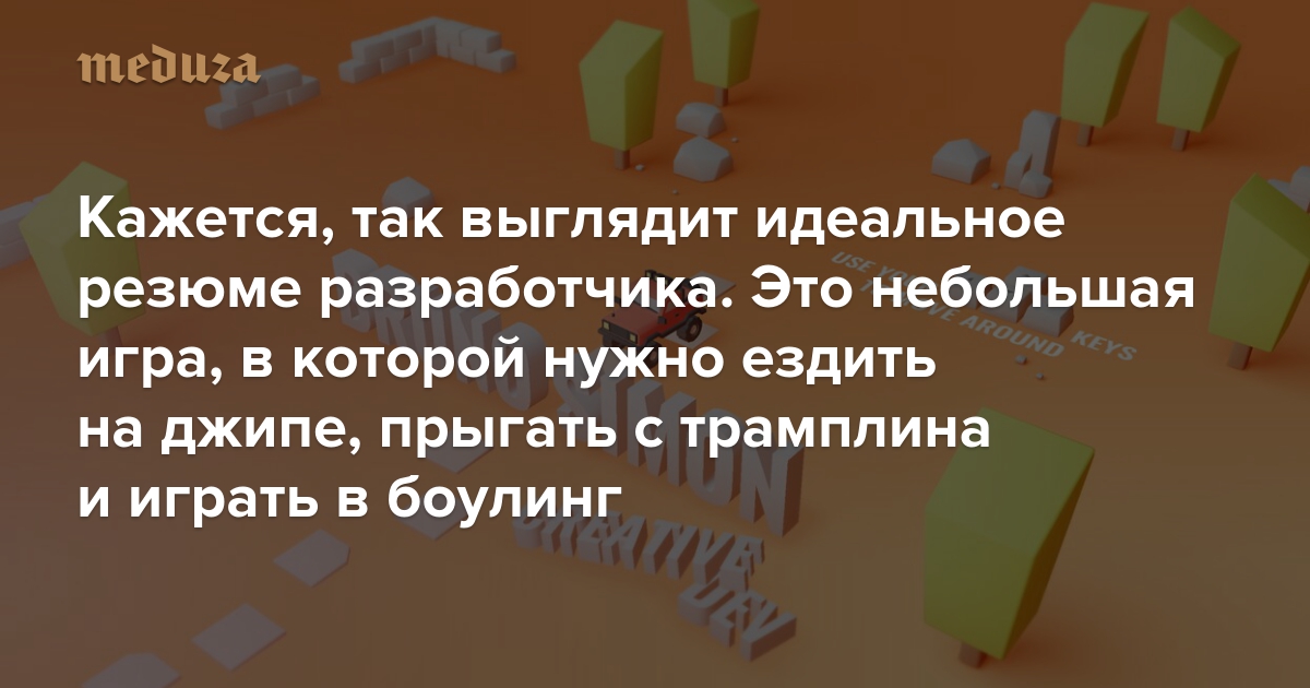 Кажется, так выглядит идеальное резюме разработчика. Это небольшая игра, в которой нужно ездить на джипе, прыгать с трамплина и играть в боулинг