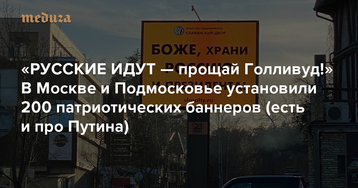 Жители Москвы и Подмосковья обратили внимание на баннеры с лозунгами «БОЖЕ, храни РОССИЮ и президента!», «РУССКИЕ ИДУТ — прощай Голливуд!», «Наступило ВРЕМЯ РОССИИ как самого БЕЗОПАСНОГО МЕСТА на Земле» и другими пафосными цитатами. Щиты с этими надписями можно увидеть на Рублево-Успенском, Новорижском, Ильинском, Минском, Калужском, Каширском, Ярославском и Ленинградском шоссе. Всего установлено около 200 баннеров.