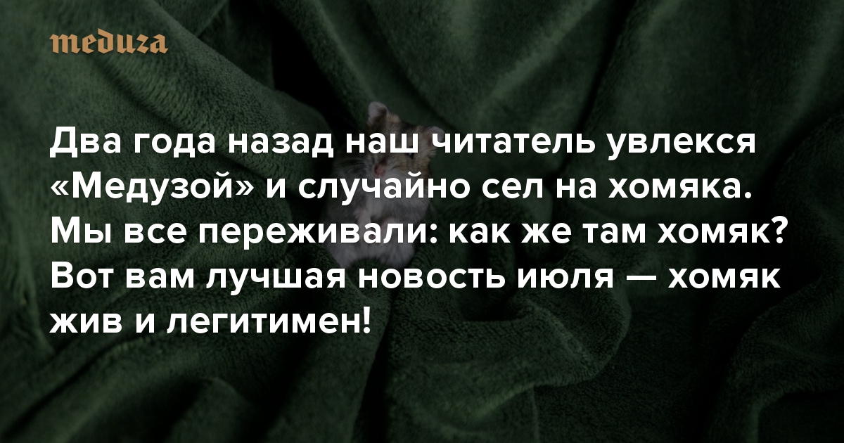 Два года назад наш читатель увлекся «Медузой» и случайно сел на хомяка. Мы все переживали: как же там хомяк? Вот вам лучшая новость июля — хомяк жив и легитимен!