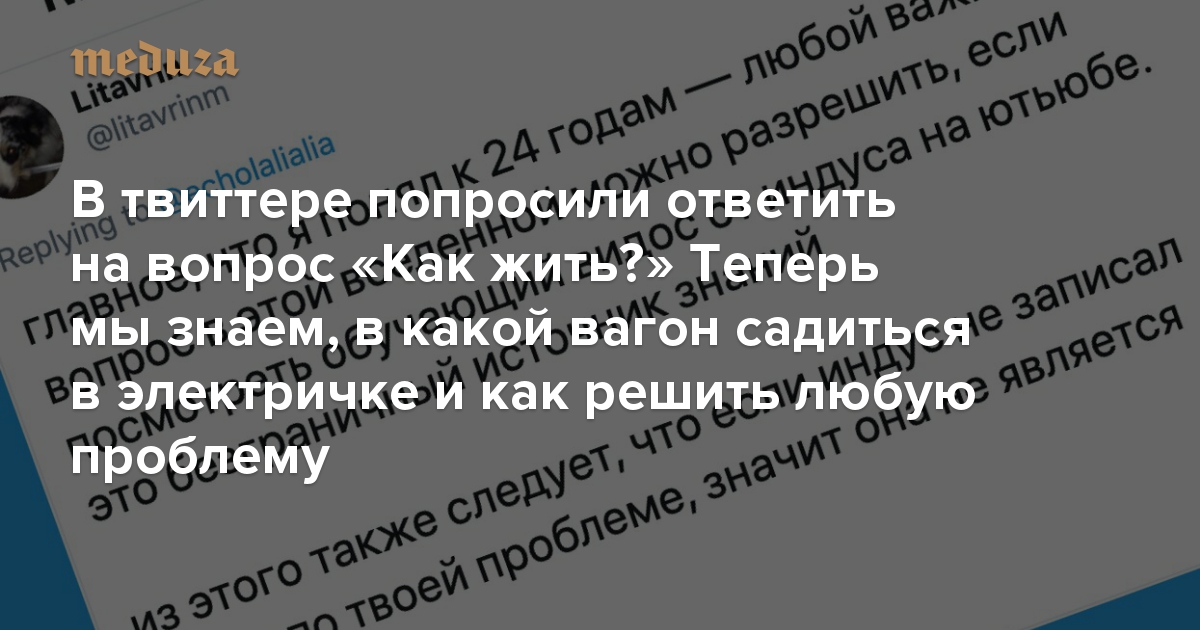 В твиттере попросили ответить на вопрос «Как жить?» Теперь мы знаем, в какой вагон садиться в электричке и как решить любую проблему Посоветуйте нам тоже что-нибудь! Рассчитываем на вашу мудрость