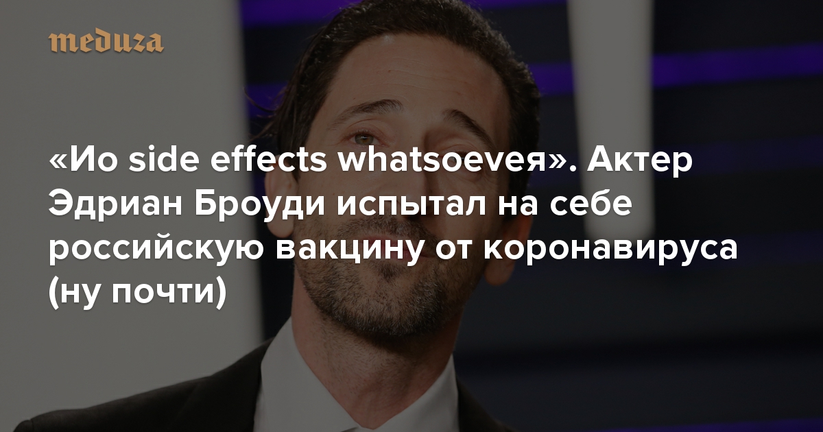 Американский актер Эдриан Броуди («Пианист») сообщил в инстаграме, что стал добровольцем в испытаниях российской вакцины от коронавируса. Как следует из поста, побочные эффекты проявились немедленно — и они довольно необычны.