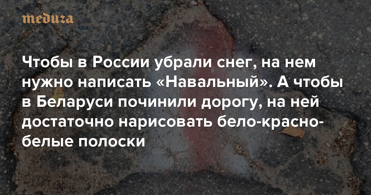 Чтобы в России убрали снег, на нем нужно написать «Навальный». А чтобы в Беларуси починили дорогу, на ней достаточно нарисовать бело-красно-белые полоски