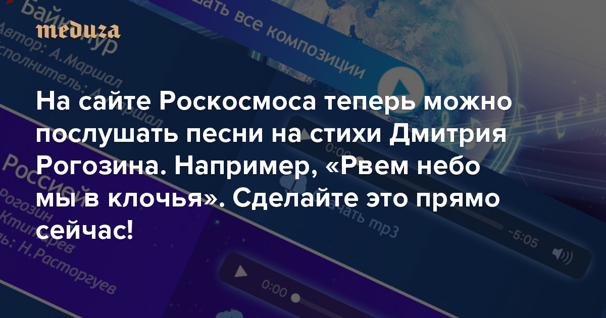 На сайте Роскосмоса теперь можно послушать песни на стихи Дмитрия Рогозина. Например, «Рвем небо мы в клочья». Сделайте это прямо сейчас!