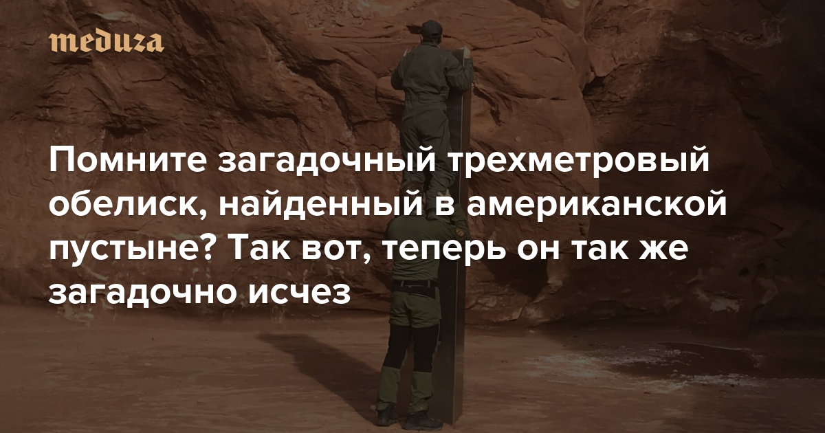 Неделю назад немало шума наделала история о том, что в пустыне американского штата Юта обнаружили массивный металлический столб около трех метров в высоту. Блестящий обелиск, будто вросший в красную скалистую почву, заметили с вертолета сотрудники Департамента общественной безопасности штата. Чиновники предположили, что монолит могли изготовить художники в рамках какого-нибудь арт-проекта или просто фанаты «Космической одиссеи» — обелиск очень напоминал тот, который фигурировал в фильме.