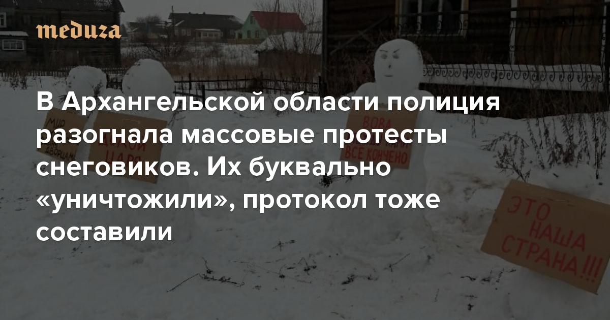 В Архангельской области, деревне Зачачье, полиция разогнала акцию протеста снеговиков с плакатами «Долой царя», «Вова, между нами все кончено», «Это наша страна!!!» и «Мир хижинам, войну дворцам». Полиция действовала жестко: по сообщению «Двина сегодня», участников несогласованной акции буквально «уничтожили», их плакаты забрали.