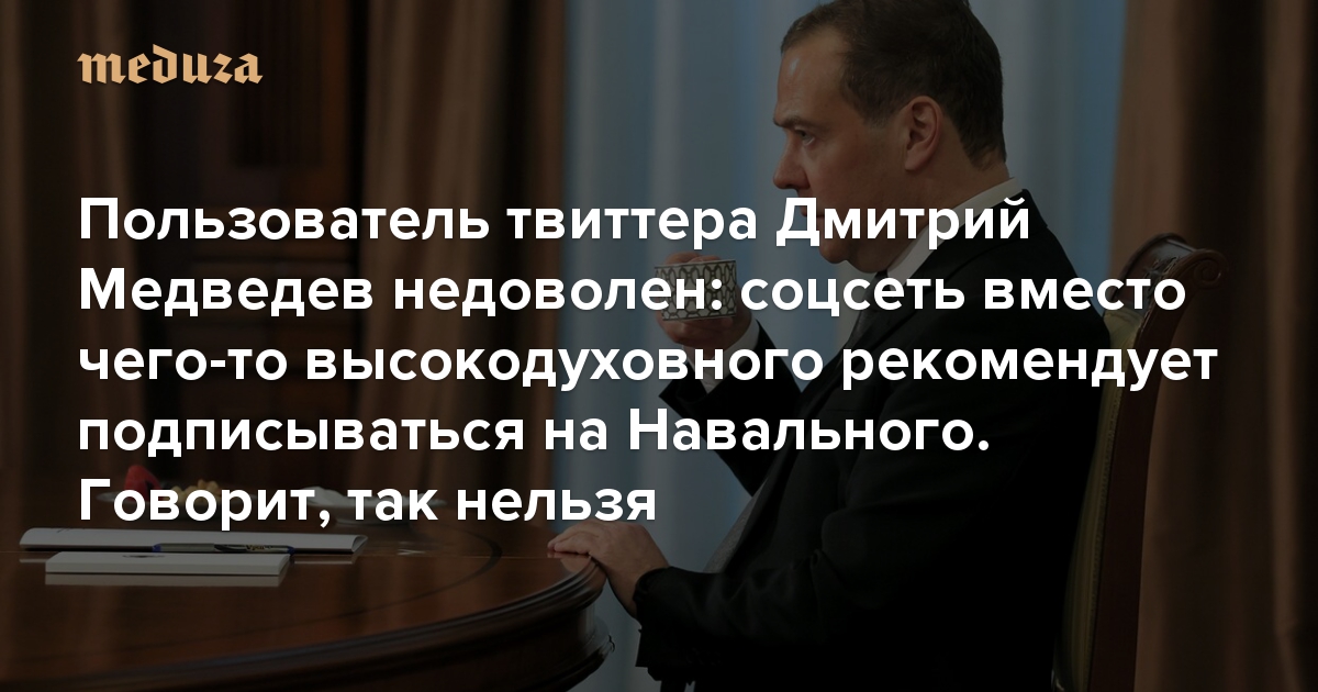 Пользователь твиттера Дмитрий Медведев недоволен: соцсеть вместо чего-то высокодуховного рекомендует подписываться на Навального. Говорит, так нельзя