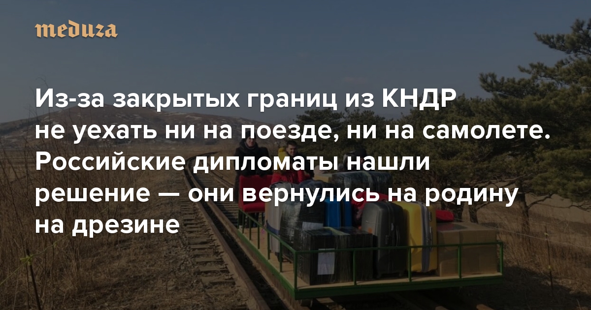 В конце февраля группа из восьми сотрудников посольства России в КНДР и членов их семей решила вернуться на родину. Сначала они ехали 32 часа на поезде, затем два часа на автобусе до ближайшего с границей населенного пункта. Граница России и КНДР проходит по реке Туманная; через нее нет автомобильных и пешеходных мостов — только один железнодорожный. И чтобы пересечь реку в отсутствие поездов, дипломатам пришлось толкать дрезину. «[Нужно было] заблаговременно изготовить тележку, поставить ее на рельсы, разместить на ней вещи, усадить детей — и в путь», — написал МИД РФ в своем аккаунте в телеграме.