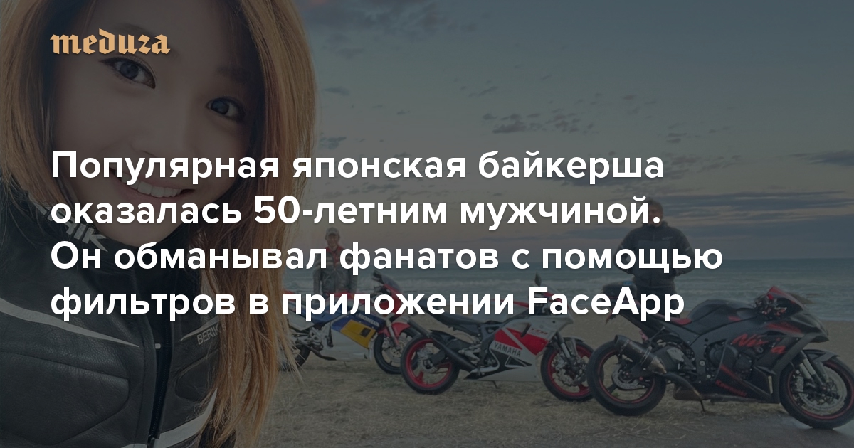 Молодая байкерша из Японии, прославившаяся своими фотографиями с мотоциклом Yamaha в соцсетях, оказалась 50-летним мужчиной по имени Цзунгу. Он превращался в девушку с помощью фильтров в популярном приложении FaceApp.