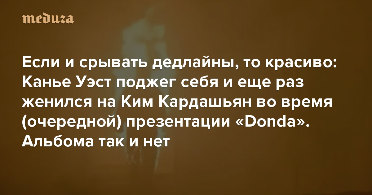 Если и срывать дедлайны, то красиво: Канье Уэст поджег себя и еще раз женился на Ким Кардашьян во время (очередной) презентации «Donda». Альбома так и нет