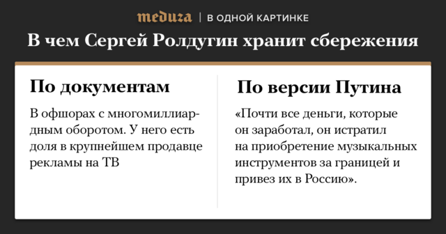 Журналисты на основании документов регистратора офшоров выяснили, что друг Владимира Путина, виолончелист Сергей Ролдугин владел до 2015 года офшорами с многомиллиардным оборотом, а доля в компании Vi ему принадлежит до сих пор. Источники даже советовали называть его «хранителем» состояния. Владимир Путин спустя три дня после публикации расследования заявил, что гордится своим другом, который почти все заработанные деньги тратит на покупку музыкальных инструментов. По словам Путина, никаких миллиардов Ролдугин не зарабатывал.