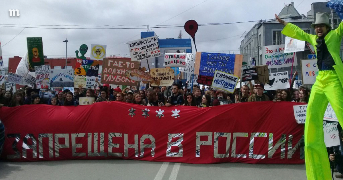 В Новосибирске состоялась первомайская «Монстрация» — традиционное шествие с абсурдными лозунгами. Ее участники прошли по главному проспекту города с плакатами и транспарантами «Он вам не лимон», «Прекратите оскорблять чувства ворующих», «Вся власть совятам», «У России два врага — чернослив и курага». Один из участников акции принес флаг «Соединенных штатов Сибири» — это работа омского художника Дамира Муратова, на которой вместо звезд на полосатом полотнище изображены снежинки. В голове колонны «монстранты» растянули баннер «Запрещена в России» — главный лозунг акции 2017 года.