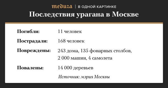 Днем 29 мая в Центральной России прошел ураган. В Москве порывы ветра вырвали деревья, повредили уличные столбы и остановки транспорта. Погибли 11 человек, более 160 получили травмы.