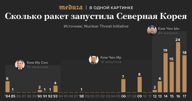 Северная Корея только в августе 2017 года провела четыре ракетных испытания. Последняя из этих ракет пролетела над японским островом Хоккайдо и упала в Тихий океан 29 августа. Всего за время своего правления лидер КНДР Ким Чен Ын провел 84 запуска. Это в два с половиной раза больше испытаний, чем успели провести его предшественники с 1984 года, когда была запущена первая баллистическая ракета.