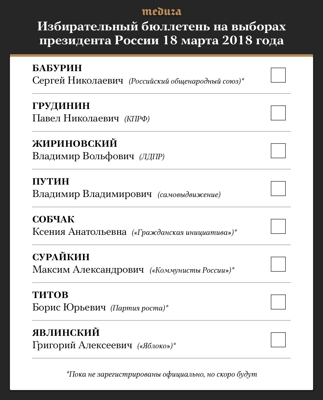 6 февраля Центральная избирательная комиссия зарегистрировала кандидатом в президенты Владимира Путина. Он стал первым, кто успешно прошел процедуру сбора подписей. ЦИК подтвердил, что еще пятеро кандидатов также сдали необходимое количество качественных подписей. В результате в бюллетене будет восемь кандидатов.