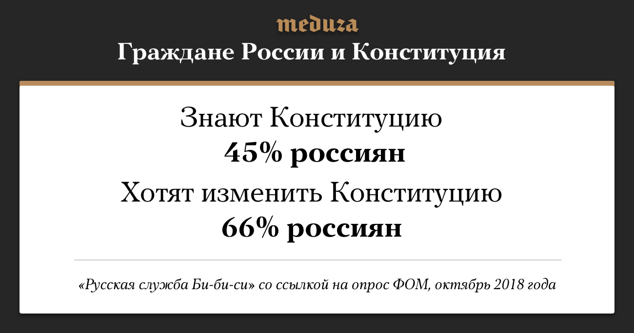 Социологи ФОМ зафиксировали самую высокую за 15 лет поддержку идеи изменений Конституции России — ее одобряют 66% граждан страны (пять лет назад — только 46%). При этом менее половины россиян говорят, что знают основные положения Конституции. В начале октября глава Конституционного суда Валерий Зорькин опубликовал статью, в которой написал о необходимости внесения «точечных изменений» в Конституцию.