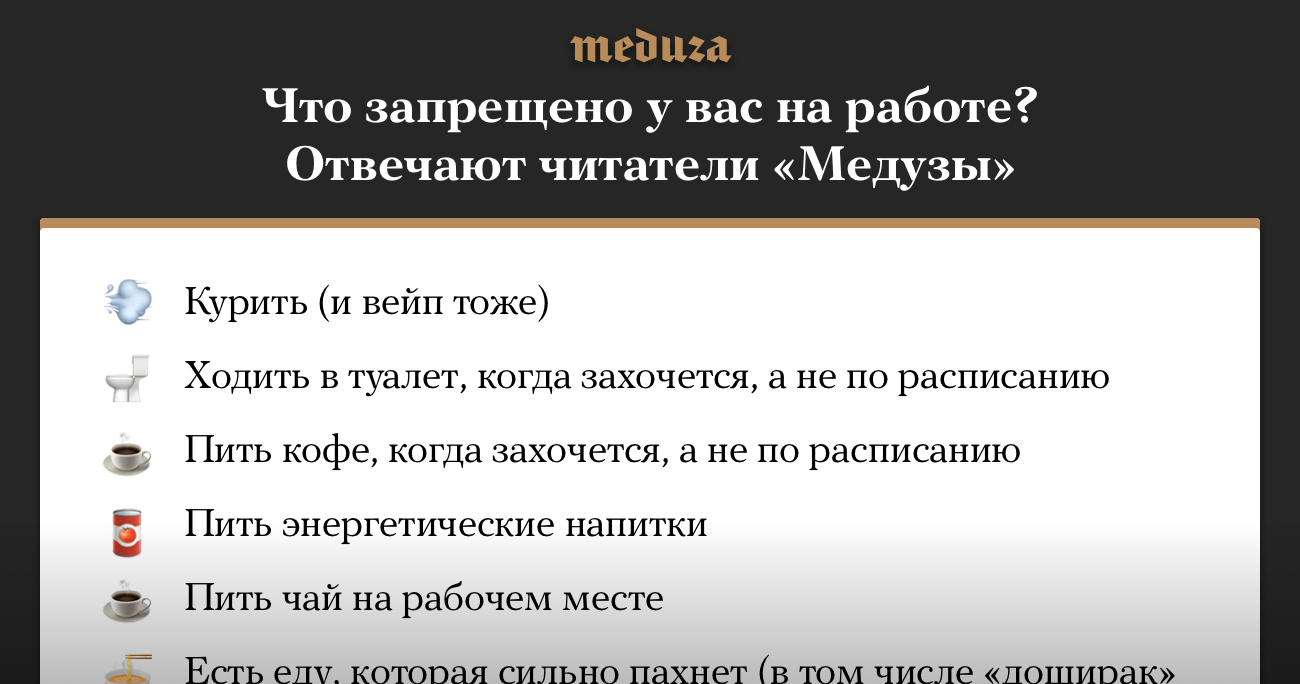 Мы спросили читателей «Медузы» о запретах на работе. Вот что вы ответили (о, ужас!)