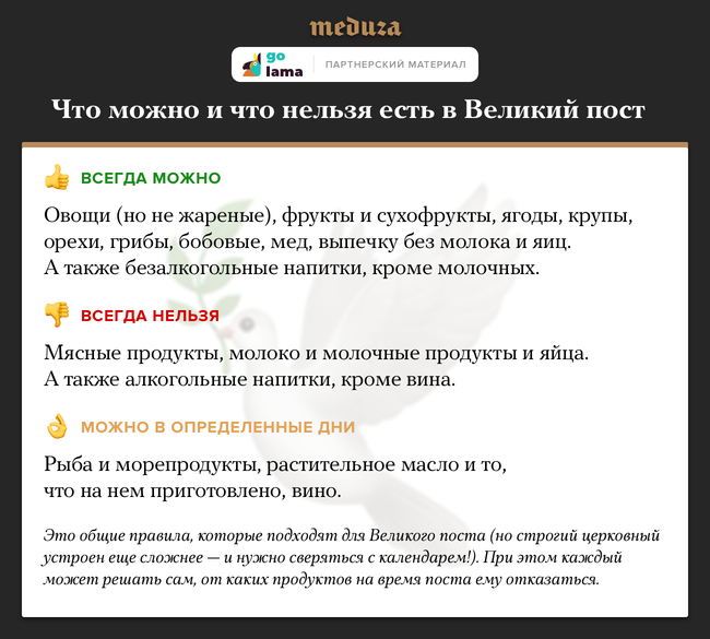 Пост или нет — а есть хочется. Любые продукты можно заказать с доставкой на дом с помощью сервиса golama — из магазинов «ВкусВилл» (за 149 рублей), а также Metro и «Лента» (290 рублей). Минимальной суммы заказа нет, а продукты привозят в тот же день и минимум через 45 минут после заказа. Читателям «Медузы» сервис дарит скидку 500 рублей на первый заказ. Чтобы получить ее, достаточно ввести промокод WOWMEDUZA при оформлении корзины покупок.