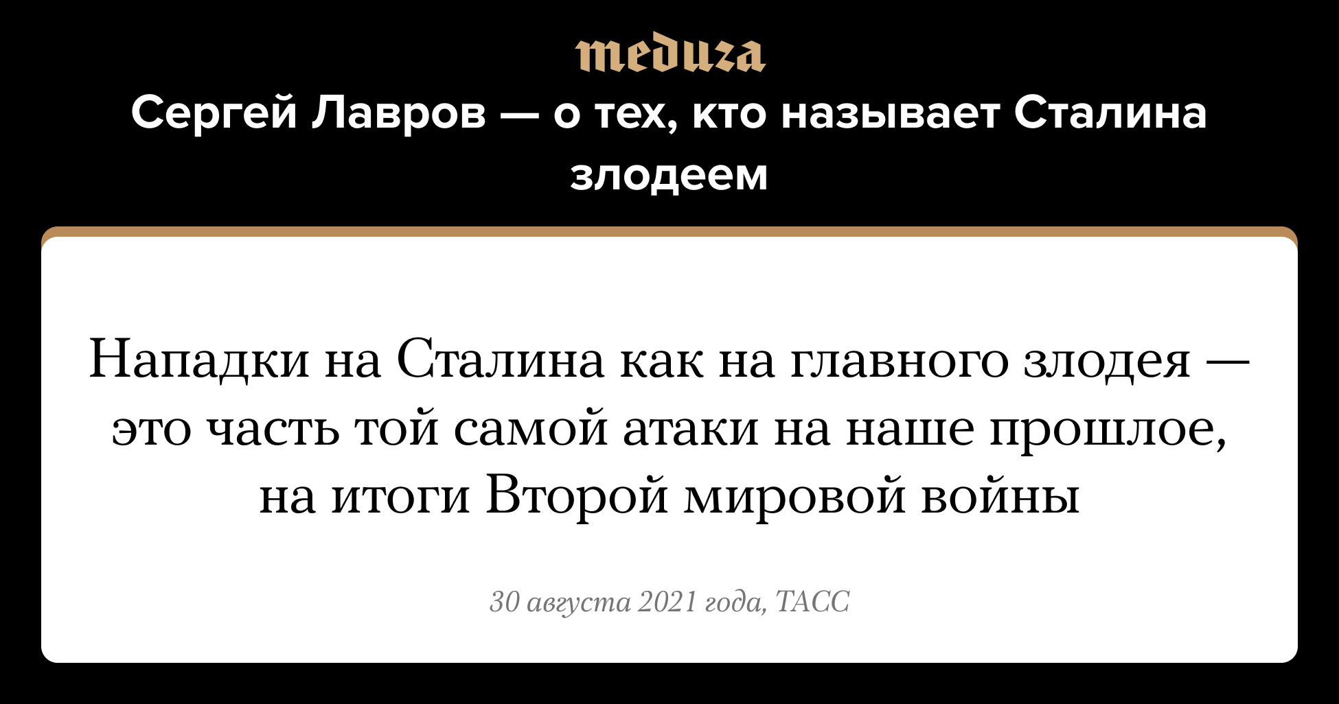 30 августа министр иностранных дел России Сергей Лавров встретился в Волгограде с ветеранами Великой Отечественной войны. В ходе встречи глава МИД заявил, что внешние нападки на историческое прошлое России нацелены на то, чтобы переписать историю и политически ослабить страну. Среди прочего Лавров сказал, что «нападки на Сталина как на главного злодея», а также «сваливание в одну кучу» всего, что Сталин сделал, — это тоже часть атаки на прошлое России. «Историю, конечно, нужно воспринимать во всей ее полноте, во всей ее неоднозначности, ее сложности», — сказал министр. Если вам интересно, что происходило в годы правления Сталина, вам помогут наши материалы о сталинских репрессиях, затронувших 1,7 миллиона человек. А вот здесь можно почитать мнения ученых, почему фигура Сталина по-прежнему так популярна.