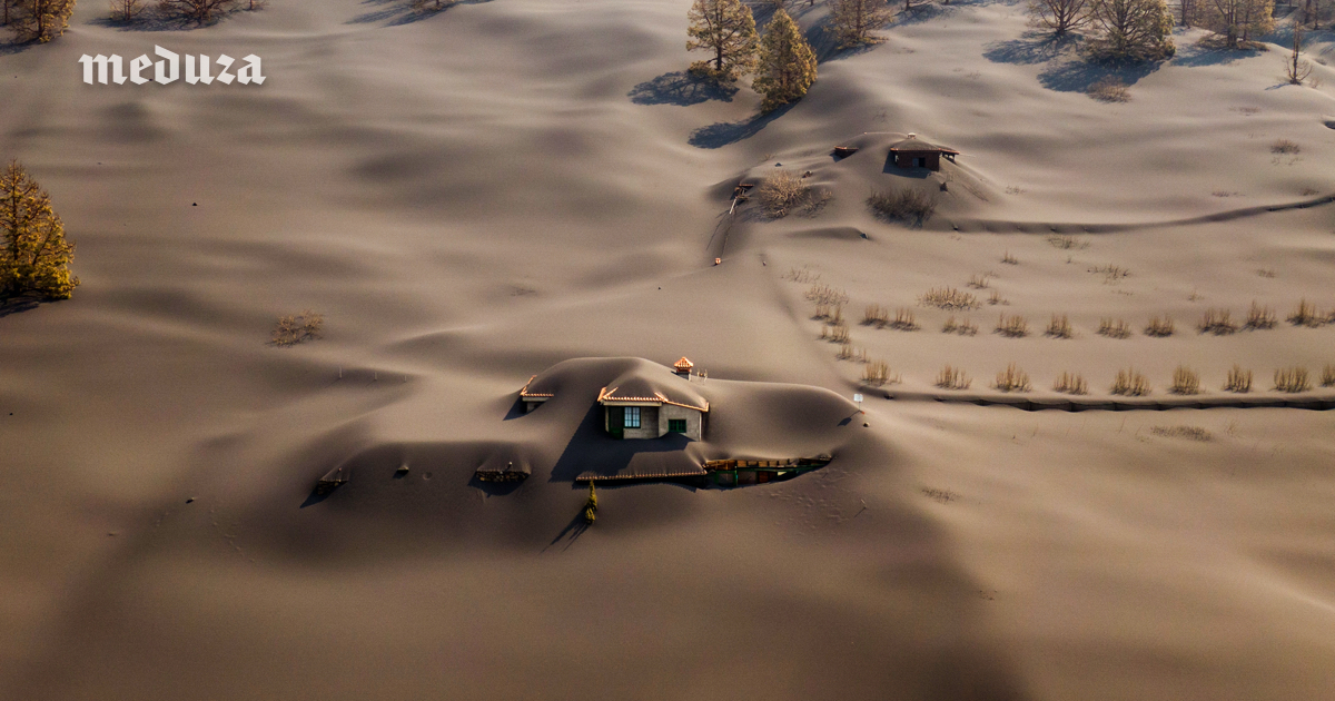 Пепел от извергающегося вулкана на Канарских островах покрыл дома и деревья. Фотография