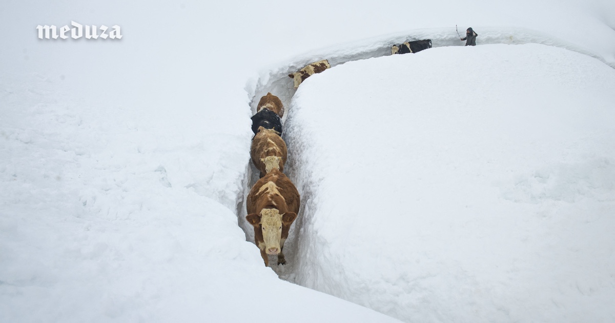 Фермер ведет коров в деревне Оваджик в провинции Тунджели на юго-западе Турции, находящейся на высоте 1500 метров над уровнем моря. Для Оваджика снег — нормальное явление, однако в последние годы его, как и других осадков, было мало — из-за чего фермеры собирали плохие урожаи. Поэтому теперь жители деревни называют двухметровые сугробы благом. Во многих регионах Турции нынешней зимой наблюдаются аномально низкие температуры, сопровождающиеся большим количеством снега, в том числе в южных курортных районах. Так, в Анталье снег выпал впервые за 29 лет. В Стамбуле из-за снегопада в конце января более суток не работал международный аэропорт, были задержаны и отменены сотни рейсов.