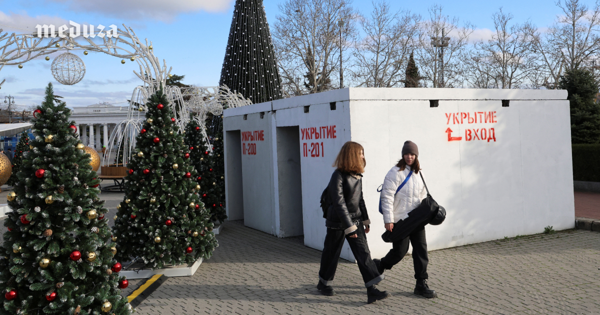 На кадре, снятом 27 декабря, видно, как прохожие идут по площади Нахимова в центре аннексированного РФ Севастополя на фоне новогодних декораций и двух размещенных встык бетонных укрытий. Мобильные убежища на случай ракетных атак в этом месте возвели в августе 2024-го (а заодно демонтировали другое «самовольно» установленное местным предпринимателем укрытие). В каждом может поместиться до 30 человек. На левой от входов стене конструкции нанесена цитата Владимира Путина: «Мы готовы принять любой вызов времени и победить»