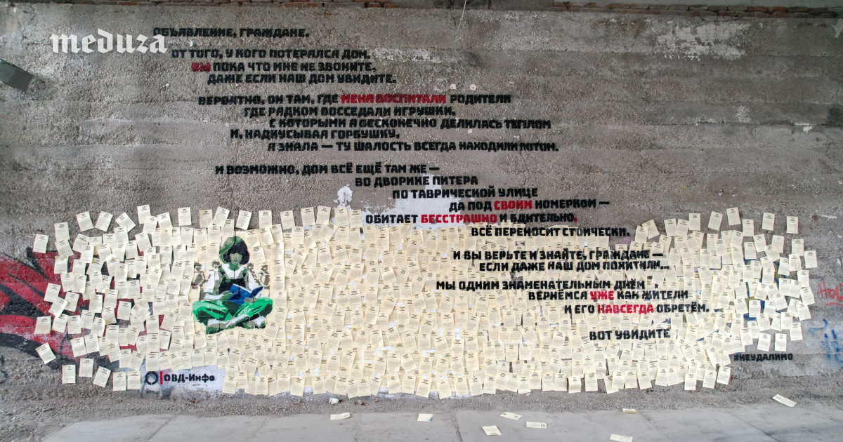 Художник Иван Неудалимо к третьей годовщине начала полномасштабной российско-украинской войны создал в Белграде стрит-арт с историями 700 россиян, которых преследуют по политическим мотивам. Арт-проект размещен на стене под Бранковым мостом. Информацию о политзаключенных Неудалимо получил от правозащитного проекта «ОВД-Инфо», который и рассказал о работе художника. Как рассказал Неудалимо, истории политзаключенных дополняет оммаж к акции Ольги Мисик, которая во время протестов в Москве в 2019 году читала сотрудникам полиции и Росгвардии Конституцию РФ. «У нас потерялся дом. И не просто потерялся, а его у нас похитили. И продолжают похищать — у нас, у вас, у них», — прокомментировал работу художник. По данным «ОВД-Инфо», на сегодняшний день в России около 1400 человек, которых преследуют по политическим мотивам, лишены свободы. Правозащитники призывают присылать им письма через сервис «Весточка».