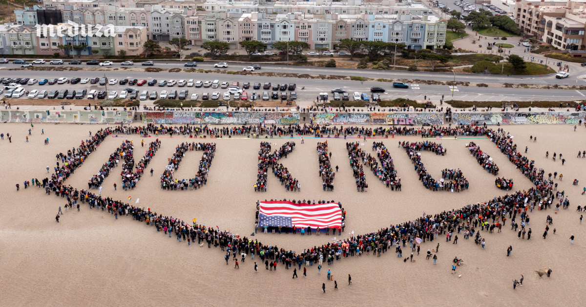 В США 14 июня прошла серия акций протеста против политики Дональда Трампа и его администрации. В свой день рождения президент принял в Вашингтоне парад, посвященный 250-летию образования американской армии, — и это мероприятие (вкупе с недавним вмешательством главы государства в подавление протестов в Лос-Анджелесе) вызвало недовольство значительной части общества. Акции под лозунгом «Нет королей» (No Kings) были организованы почти в каждом штате. В Сан-Франциско на пляже Оушн-бич (на фото) демонстранты выстроились в живую цепь. Так они образовали надпись «Нет короля!»