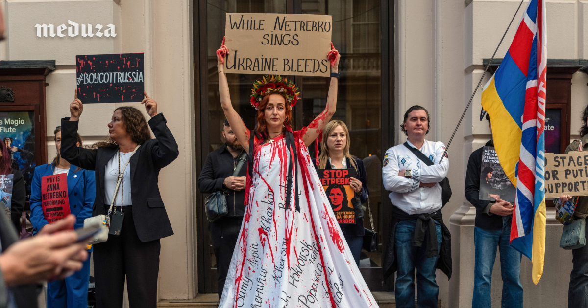 Украинские активисты всю неделю устраивают акции протеста в Лондоне возле Королевского оперного театра. Причина их недовольства — в «Ковент-Гарден» впервые за шесть лет приезжает российская оперная певица Анна Нетребко. 11 сентября она с большим успехом выступила на открытии очередного сезона Лондонского театра, спев в новой постановке «Тоски» Джакомо Пуччини. В прошлом Нетребко считалась приближенной к российской власти. Певица была доверенным лицом Владимира Путина на выборах 2012 года. А два года спустя она пожертвовала деньги Донецкому оперному театру и позировала для фото с лидерами сепаратистов ДНР и флагом Новороссии. С началом полномасштабной российско-украинской войны Нетребко стали отменять выступления в Европе. В 2023-м певица публично осудила войну и дистанцировалась от властей РФ — тогда ее концерты в Европе возобновились. Один из протестных перформансов состоялся в Лондоне 11 сентября — в день выступления Нетребко в «Ковент-Гардене». На фото: активистка в белом платье, забрызганном бутафорской кровью и исписанным названиями городов Украины. В руках у нее табличка «Пока Нетребко поет, Украина истекает кровью». Рядом с ней лежит другая активистка, изображая убитую. На ней табличка «Нейтралитет убивает».