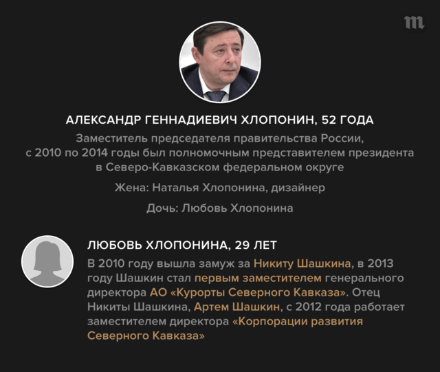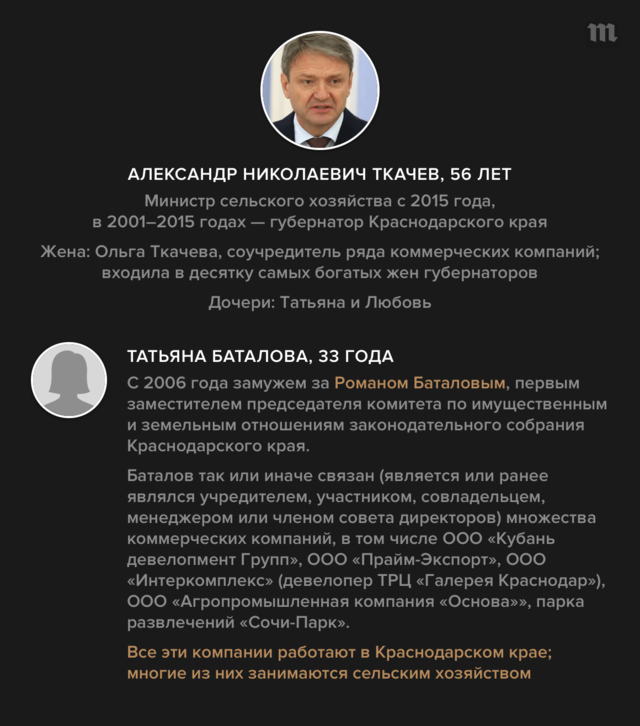«Медуза» и «Трансперенси Интернешнл-Россия» представляют совместный проект, посвященный детям высокопоставленных чиновников из администрации президента, правительства и силовых ведомств, а также руководителей госкомпаний. Наше исследование показало, что дети чиновников часто работают в тех же отраслях, которые курируют их родители, либо связаны с ними деловыми интересами. Иногда бизнесом занимаются другие родственники людей, находящихся на госслужбе (например, зять бывшего губернатора Краснодарского края, министра сельского хозяйства Александра Ткачева Роман Баталов занимается сельскохозяйственным бизнесом в регионе, которым руководил его тесть). Попробуйте сами решить, являются ли эти данные признаком конфликта интересов — ситуации, при которой прямая или косвенная личная заинтересованность чиновника влияет или может повлиять на надлежащее исполнение им должностных обязанностей.